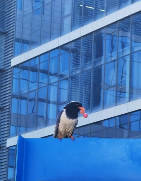圖注:這張照片是在研究院園區(qū)巧妙抓拍,呈現(xiàn)了自然與現(xiàn)代的有趣交融。畫面里,紅嘴藍(lán)鵲穩(wěn)穩(wěn)地站在藍(lán)色平臺(tái)邊緣,口中銜著飽滿紅果,神態(tài)悠然。身后玻璃幕墻高樓林立,映射出研究院的科技感。這只鳥兒仿佛是城市中的靈動(dòng)精靈,在鋼筋混凝土間尋得一方天地。這一瞬間,既展現(xiàn)...